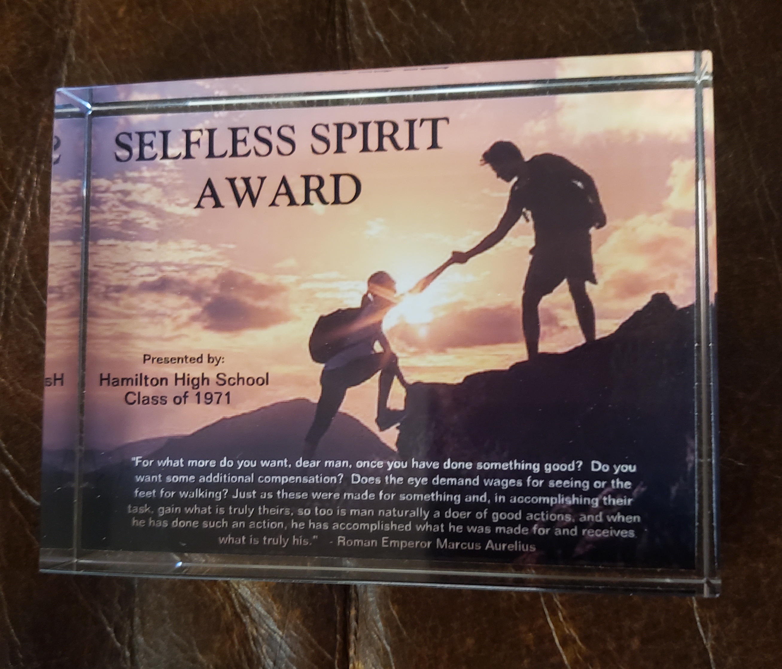 This will be a perpetual $500 award with the first presentation scheduled for May 2022. Along with the monetary gift, each winner will receive a personalized memento (paperweight). The recipient’s name will also be inscribed on both the paperweight and a plaque that will hang on the walls of Hamilton High School. Funding has been guaranteed by the author although donations will not be refused.